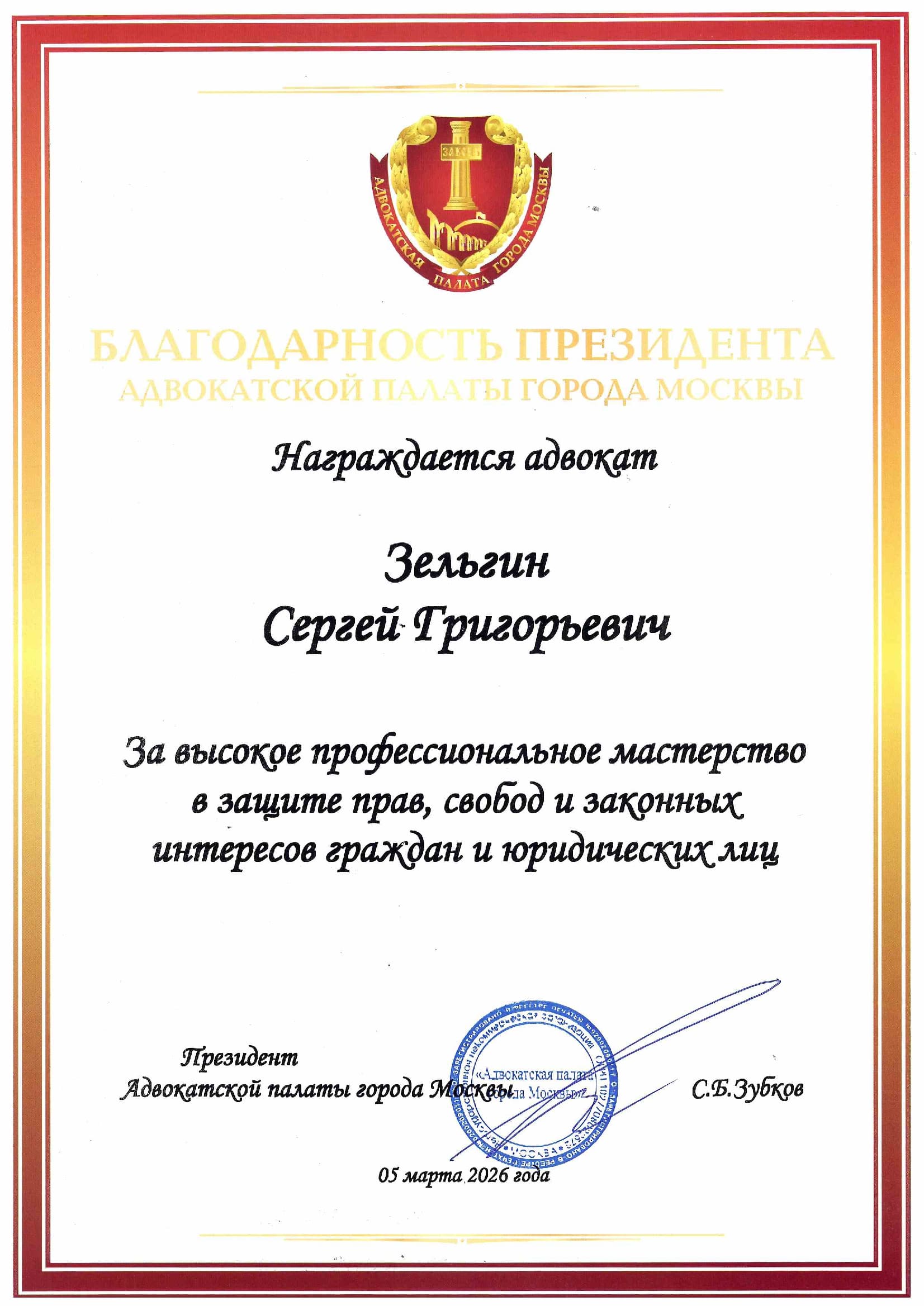 Золотая медаль «Ф.Н. Плевако». Постановление Комитета по награждению адвокатскими наградами им. Ф.Н. Плевако № 2 от 7 декабря 2021 г. (с внесением имени обладателя данной награды в Книгу почета российской адвокатуры и на Доску почета, лиц, награжденных Золотой медалью «Ф.Н Плевако» в Центральном Доме адвокатов).